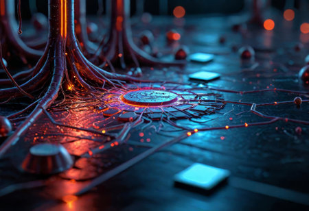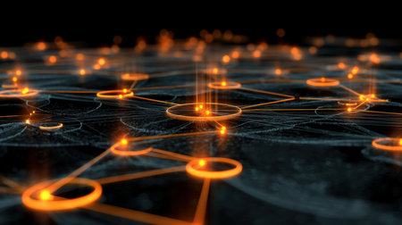 Abstract representation of a futuristic digital network, with interconnected nodes and circuits illuminated in vibrant orange and blue tones, symbolizing advanced data exchange and connectivity in a cyber environment. Generative AI