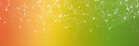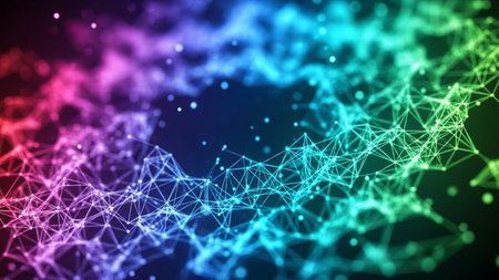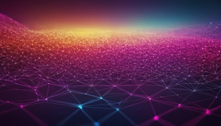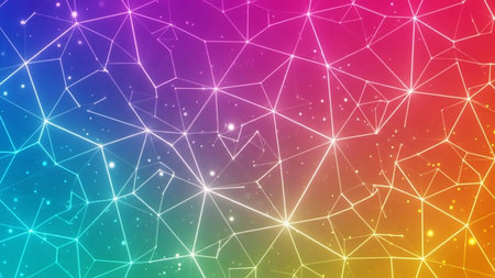 A vibrant abstract background featuring a geometric network of lines and dots with a rainbow gradient and glowing particles.
