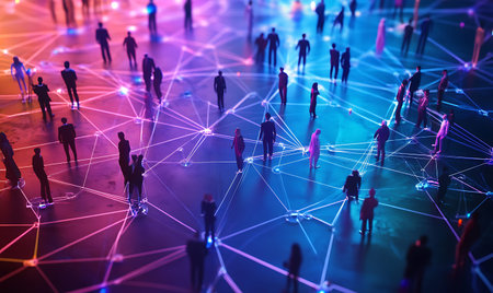 A vibrant network of 3D avatars connects through glowing lines, representing digital social interactions in an engaging virtual space.