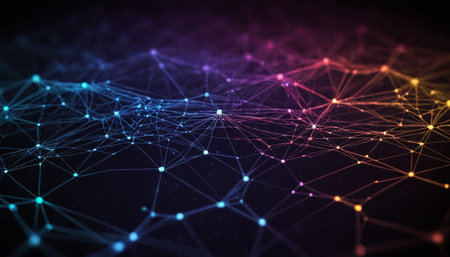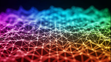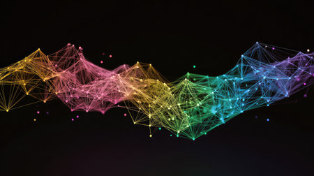 Dynamic digital network mesh displays a vibrant, colorful gradient, connecting numerous dots with abstract lines