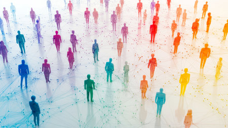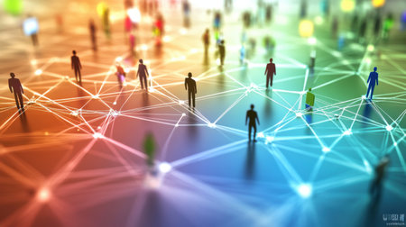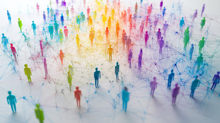 Vibrant social network imagery diverse figures connected by threads on a white background
