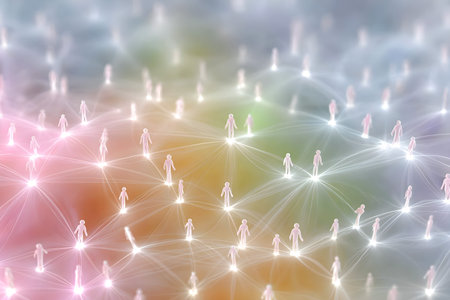 Colorful abstract illustration features glowing human figures interconnected by lines, representing social networks and digital communication in a dynamic, engaging atmosphere