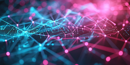 A glowing network of interconnected nodes in vibrant neon pink and cyan, linked by lines, creates a digital, abstract pattern on a dark background,...