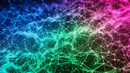 An abstract network of glowing dots and connecting lines forms a complex structure with a vibrant rainbow gradient transitioning from blue to green to pink.