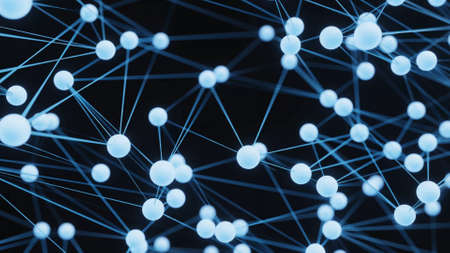 Digital blockchain concept and data transfer system. Network connection structure. Abstract background with moving dots and lines. Futuristic illustration. 3d rendering.