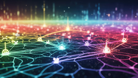 This image depicts an abstract digital network with numerous interconnected nodes. Bright lines in a rainbow of colors connect the nodes, suggesting data flow. The composition uses a low-angle perspective, creating a sense of depth and complexity. The overall aesthetic is futuristic, potentially suitable for technology-related projects.