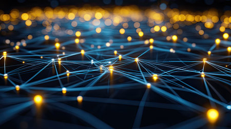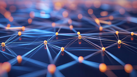 An abstract image showcases a network of interconnected nodes. The nodes have a warm, golden color, linked by lines that suggest connectivity. The composition is set against a dark background, and the lighting creates a sense of depth and dimension, suitable for technology or business applications.