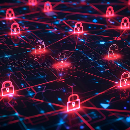 A captivating digital illustration showing a network of glowing padlocks on interconnected lines, representing security and protection in modern technology and data management.
