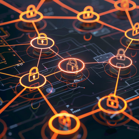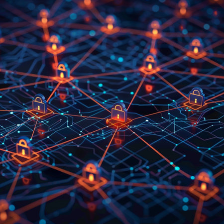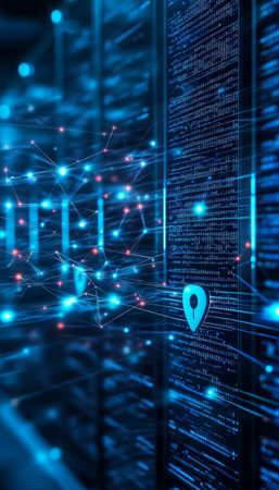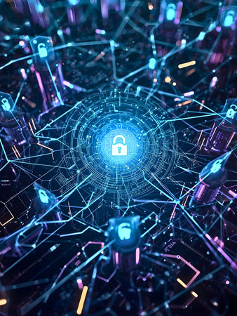 Intricate digital network view featuring glowing security icons and nodes. Perfect for technology and cybersecurity themes, illustrating connectivity and data.