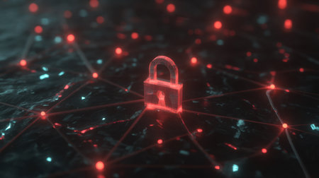 An illuminated lock, the central subject, is shown against a dark backdrop with numerous interconnected lines and glowing dots. The image features a digital, network-like composition. Suitable for visual concepts around protection, safety, and modern technological solutions. Potential uses include editorial and commercial projects focusing on digital security.