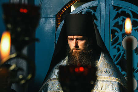 VOYUTYN, UKRAINE - 14 October 2008: Orthodox priest during holiday prayers in local church