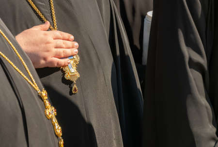 Orthodox priest holding cross hanging from neck.
