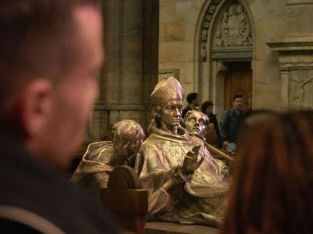 Prague, Czech republic - april 2019: Monument in the Cathedral of St. Vitus. Tourists walking and observing ancient sculptural composition. Selective soft focus. Blurred background
