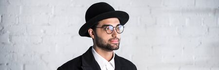 panoramic shot of handsome jewish man in glasses looking away