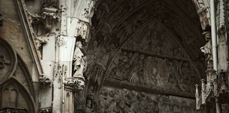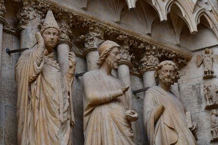 Notre Dame de Paris Cathedral Gothic style. Architectural details. Catholic saints statues