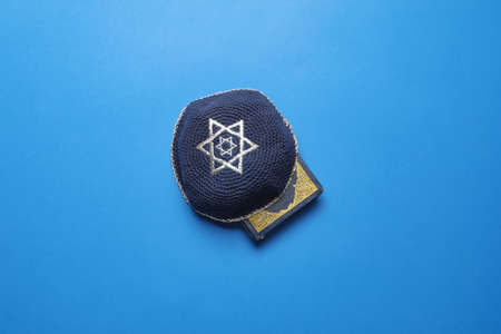Jewish cap with Torah on color background