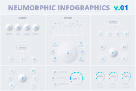 Set with neumorphic infographic design templates. Modern neumorphism vector illustration for presentation with 4, 5, 6 and 7 options or steps.