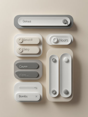 Various shaped interface buttons displayed in a grid format, featuring neutral colors ideal for modern user interface design and interaction.