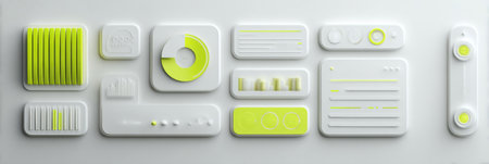 Stylized design components arranged in a clean layout with white and neon yellow colors, showcasing elements for modern digital interfaces or applications.