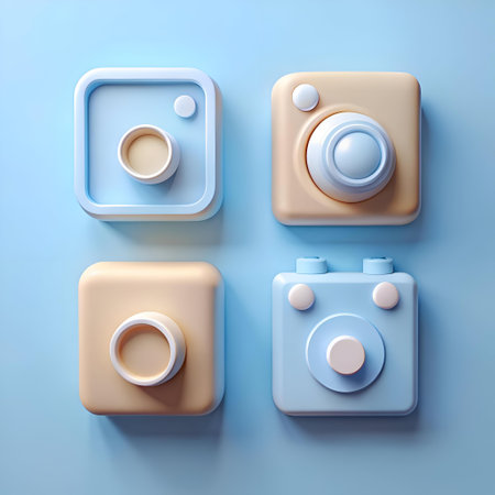 Set of four 3D camera icons in pastel blue and beige. perfect for social media. mobile apps. and website design.