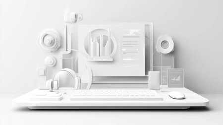 Abstract flying tech pieces on white background with mock up place. Laptop computer, speakers and headphones. Music and technology concept. 3D Rendering