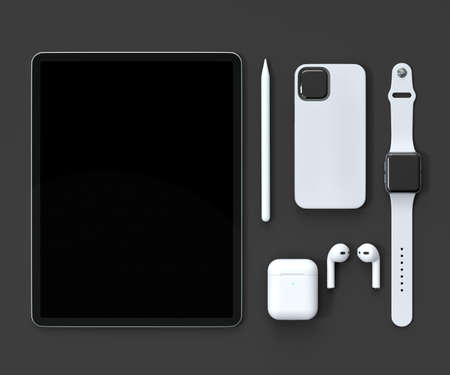 Computer tablet with stylus, smart watch, phone and headphones on black.