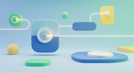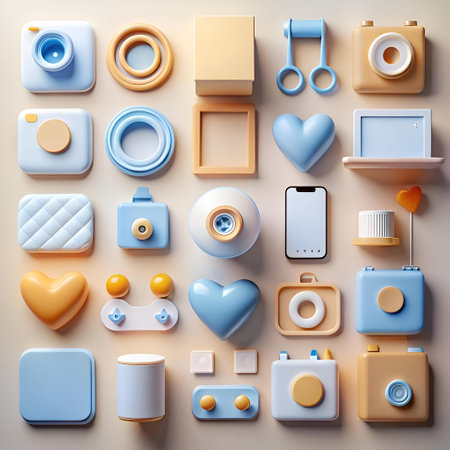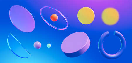 Set of 3D geometric elements including round discs, balls, glass, and ring isolated on blue background