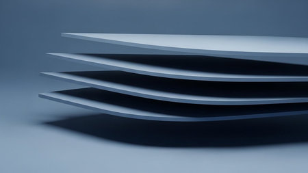 Stacked flat light blue paper layers with rounded edges cast subtle shadows on a matching blue background, creating a minimalist abstract