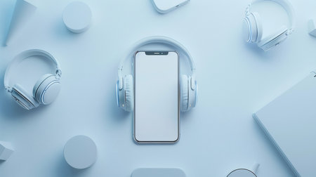 Smartphone mockup with headphones on blue background. 3d rendering
