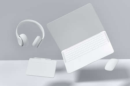 Realistic monochrome laptop with graphic tablet, mouse and headphones isolated on white background. 3D rendering concept of creative designer equipment and compact workspace