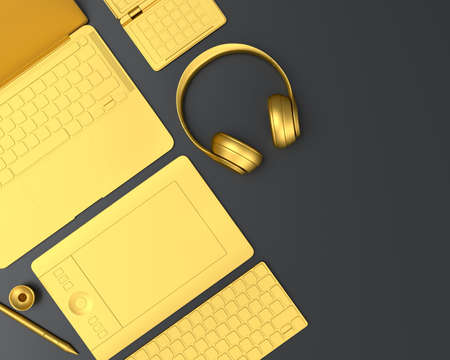 Top view of gold designer workspace and gear like laptop, tablet, keyboard and phone on black table background. 3d rendering of accessories for drawing, sketching and illustrator or photography tools