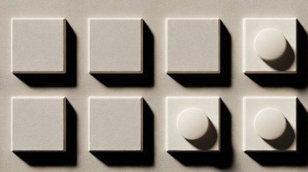 This image showcases a minimalist arrangement of geometric shapes, highlighting squares and a circle against a soft textured background, with captivating shadows.