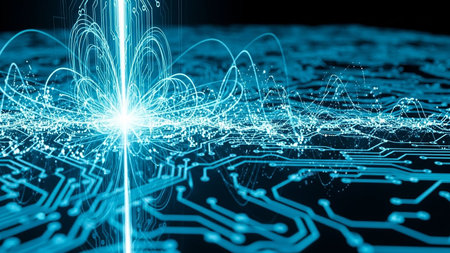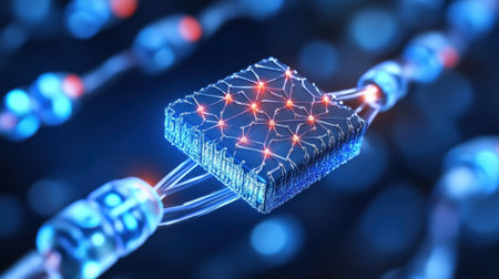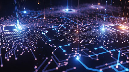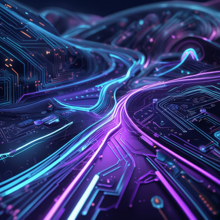 A close-up view of a circuit board with red lines and a blue glow in the background