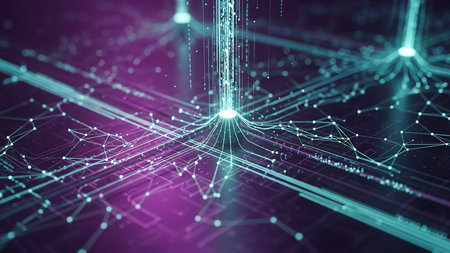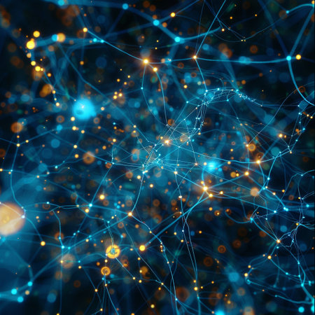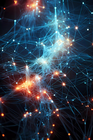 3d render of network structure with glowing dots and lines on dark background