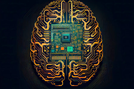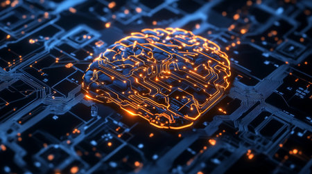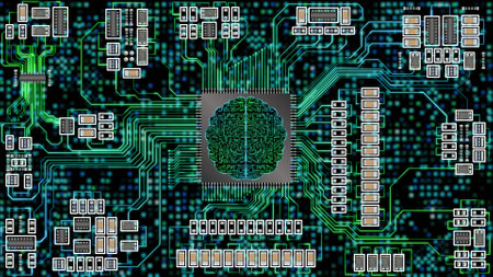 artificial brain concept image with circuit board and chipset with bright circuit lines. concept for artificial intelligence algorithm, data analysis and deep learning.