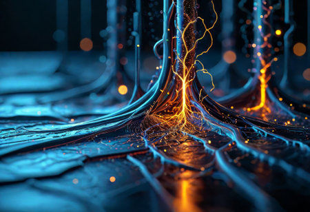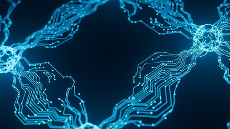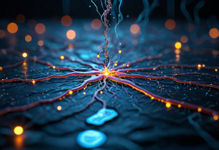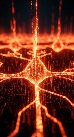 A detailed depiction of neuron activity showcases the complex web of connections within the nervous system. The bright synapses highlight the importance of communication between cells.