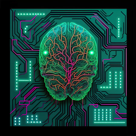 Projecting holographic brain displaying circuit traces and glowing data points in virtual space. Futuristic, technological, neural, digital, innovation, networking, cybernetic
