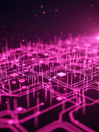 An abstract, out-of-focus view of a pink-illuminated circuit board. The image emphasizes the glowing pathways and components, creating a soft, blurred effect with bokeh highlights. The vibrant pink color dominates the scene, suggesting a digital or technological theme.