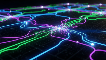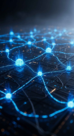 A futuristic network of glowing blue lines and nodes on a dark background