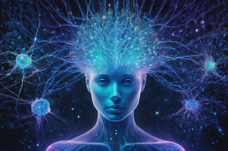 A mesmerizing blend of neuroscience and astronomy. The image depicts a neural network resembling a starry night sky.