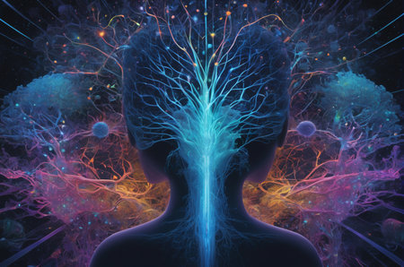 Bright neon colors swirl and pulse in a stunning abstract depiction of brain activity, creating a vivid atmosphere.