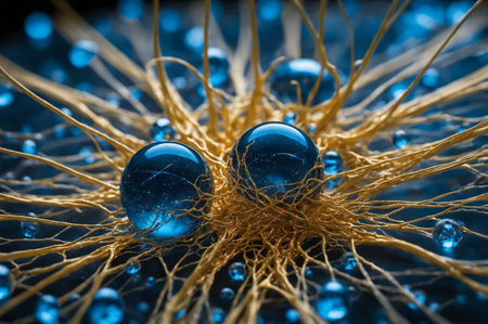 Two shimmering blue orbs rest on a bed of golden, textured strands, creating a striking visual contrast.