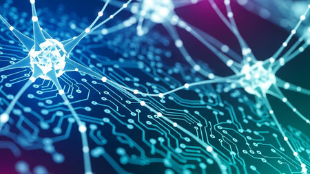 Close-up of glowing neural network nodes and connections on a digital circuit board with blue and purple hues.