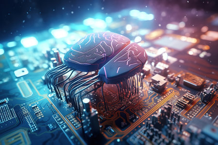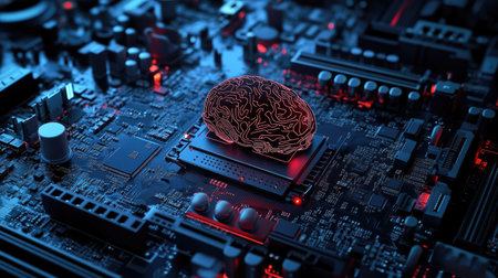 A digital illustration of a motherboard with brain elements, showcasing a powerful chipset and RAM slots for AI and gaming