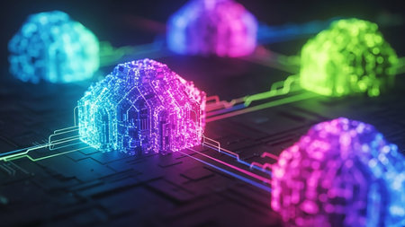 A network of glowing, digital cloud-like structures connected by illuminated lines in vibrant neon colors, representing data and connectivity.