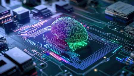 A vibrant representation of a brain atop a modern circuit board, illuminated with neon lights, symbolizing the fusion of technology and human thought.