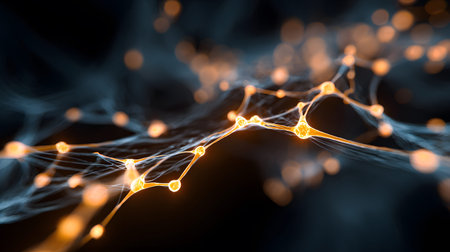A detailed depiction of neuron activity showcases the complex web of connections within the nervous system. The bright synapses highlight the importance of communication between cells.