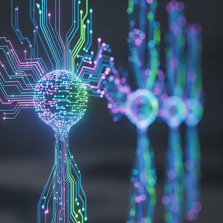 Abstract visual of neural networks with vibrant lights, showcasing network connections and data flow.