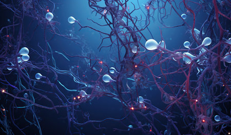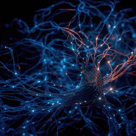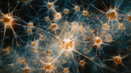 An artistic depiction presents a network of interconnected nodes and lines, resembling a complex biological structure. The composition utilizes a dark background to highlight glowing orbs and pathways in shades of blue and orange. This visualization is suitable for applications in science, technology, and design.