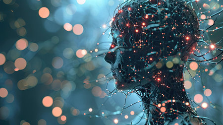 A man with a head full of colorful lights and wires, AI